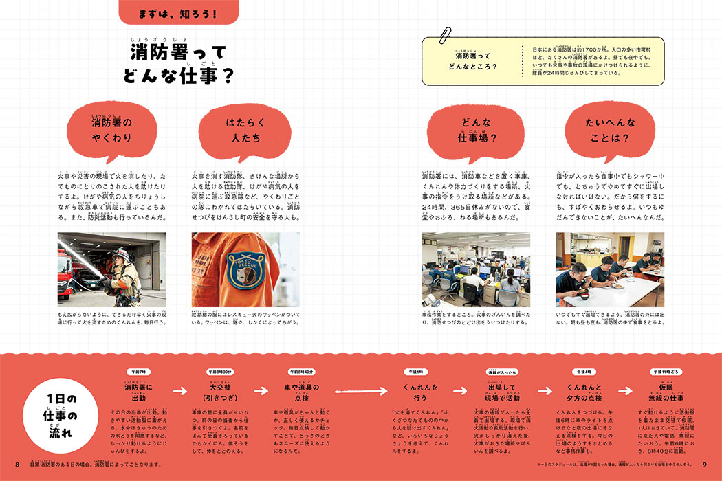 キャリア教育本の多くは高学年向けで難しいため、このシリーズは3年生が読みやすいように作っています。この巻では町の安全を守り、くらしを支えている仕事を紹介。警察と消防、そして電車の仕事についてくわしく取り上げています。「くふう」に焦点をあてているので、キャリア教育本ではわからない具体的な仕事のくふうを知ることができます。